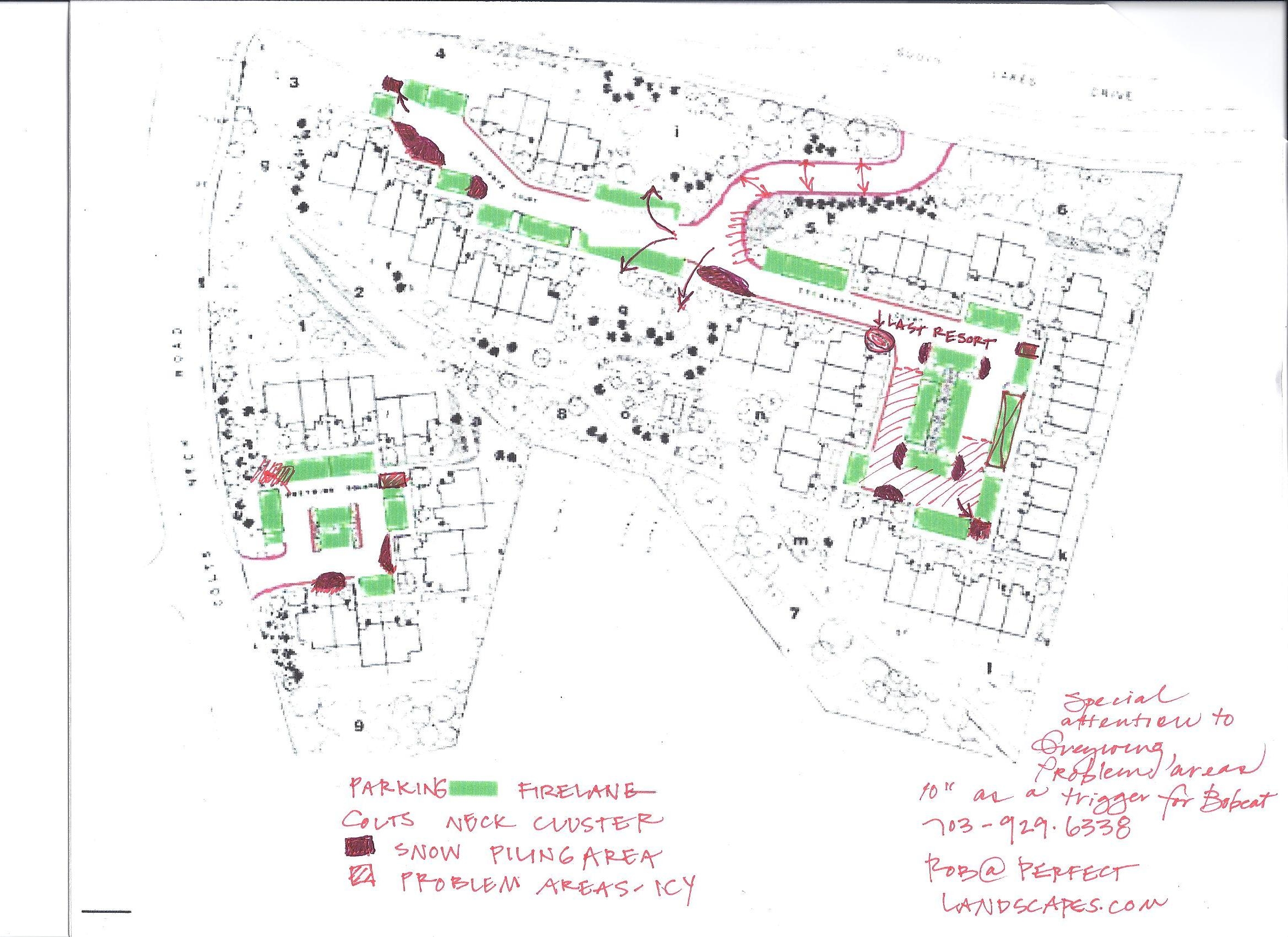 Each home in the cluster is assigned one covered parking space in the carports that are owned and maintained by the Colts Neck Cluster Association. All other parking spaces are open to cluster residents and their guests. During snowstorms, certain areas must be left clear for piling snow cleared from the road – see the Cluster Snow Map below for details. For more information on parking regulations, see the current Cluster Bylaws, or the Cluster Handbook, described above.